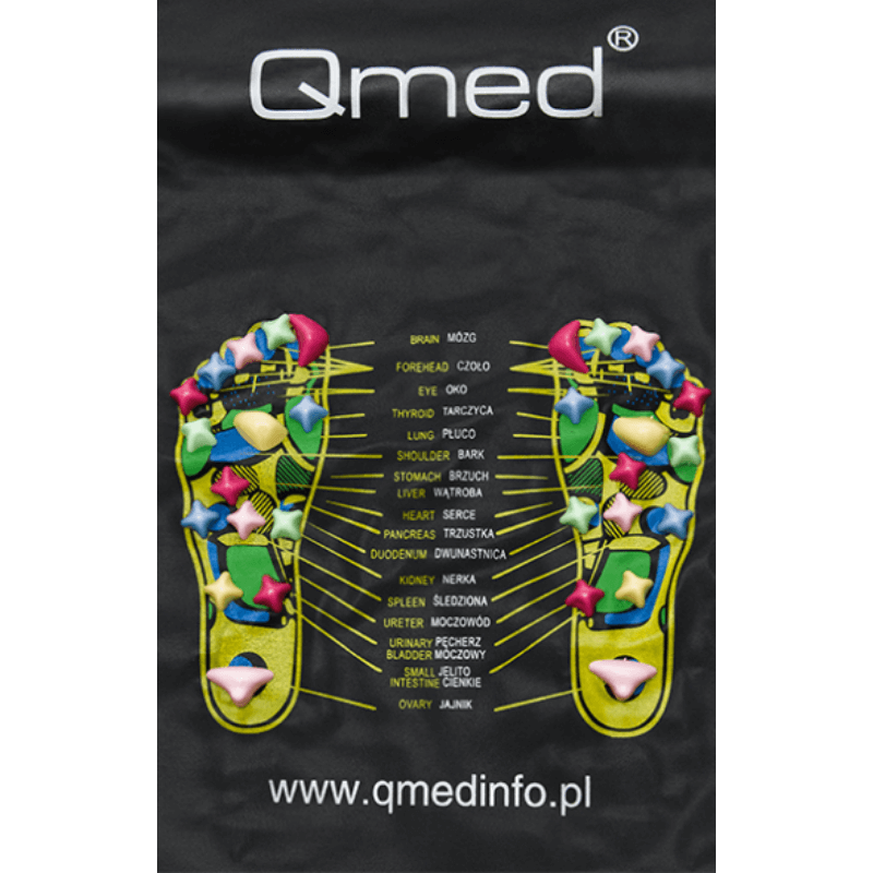 Mata do masażu stóp kamyki marki Qmed stymuluje stopę, poprawia metabolizm i krążenie krwi co przyspiesza regenerację organizmu. Również łagodzi nerwobóle i zmęczenie mięśni. Mata wywołuje przypływ energii, reguluje funkcję narządów wewnętrznych i wpływa korzystnie na odporność organizmu. Idealna do ćwiczeń korekcyjnych stóp. Stymuluje punkty refleksyjne na stopie. Pomaga usuwać toksyny z organizmu. Wykorzystywana w pomieszczeniach jak i na zewnątrz.