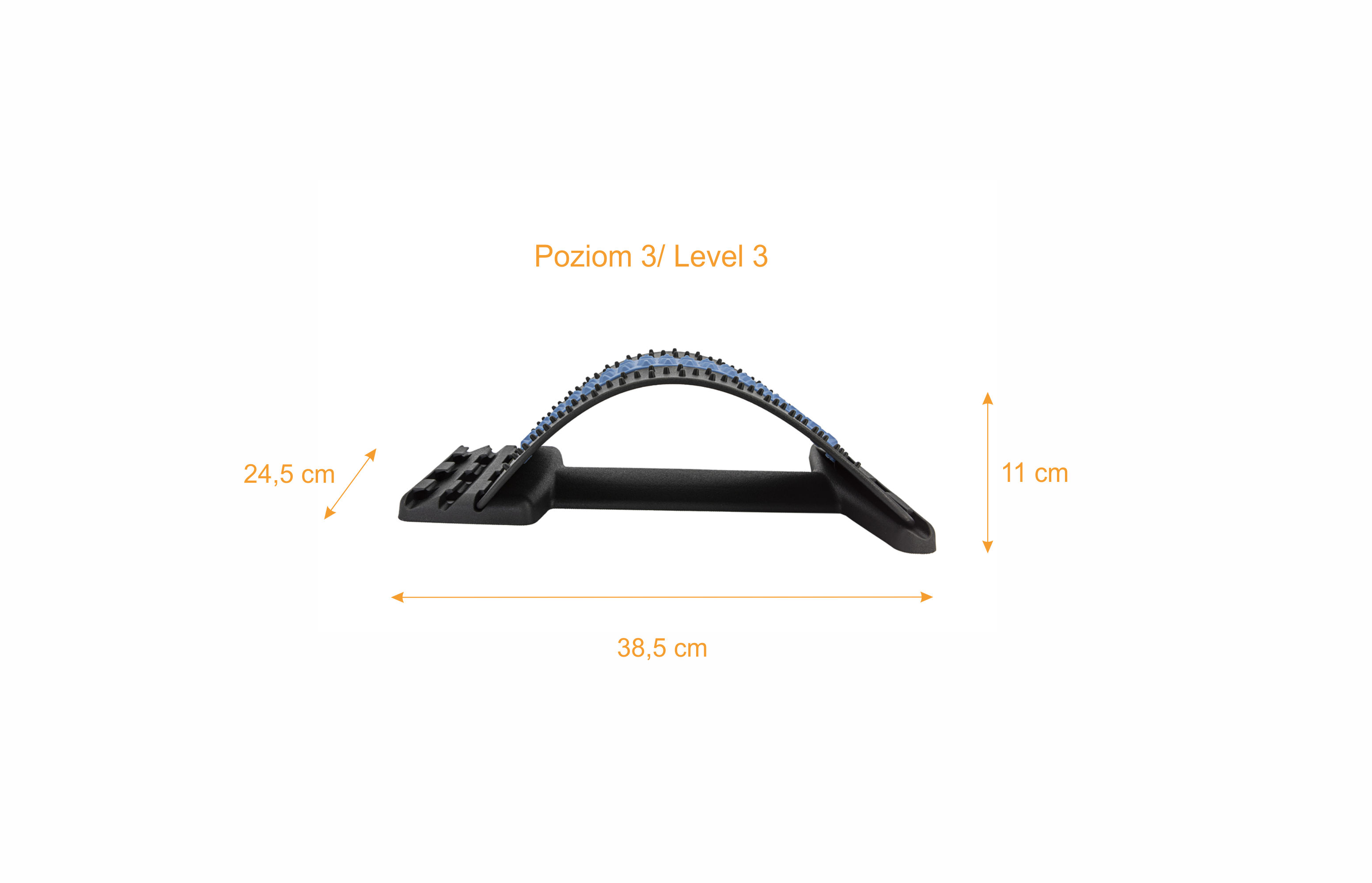 Zamocuj łuk podporowy na wybranym poziomie i połóż produkt na macie. Szersza krawędź wyrobu powinna znajdować się blisko podstawy kręgosłupa, tak aby łuk podporowy wspierał odcinek lędźwiowy pleców, a węższa krawędź produktu skierowana była w stronę głowy. Zawsze używaj produktu skierowanego w odpowiednią stronę. Usiądź plecami w stronę produktu i powoli połóż się na nim z ugiętymi kolanami. Spróbuj wyśrodkować kręgosłup na niebieskiej taśmie, która jest zaprojektowana tak, aby obejmowała go wygodnie i zapewniała dodatkowy komfort. Jeśli potrzebujesz, możesz umieścić poduszkę pod głową, aby zwiększyć swoją wygodę lub gdy podczas rozciągania się na produkcie Twoja głowa nie dotyka do podłoża.