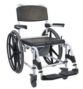 Wózek prysznicowo–toaletowy 302018-19 na dużych kołach firmy Mobilex z wyściełanym oparciem i siedziskiem. Aluminiowa konstrukcja i materiały zapewniają niezawodność i komfort w codziennym użytkowaniu przez pacjenta. Dzięki zastosowaniu dużych 24 " kół użytkownik samodzielnie może poruszać się na wózku.