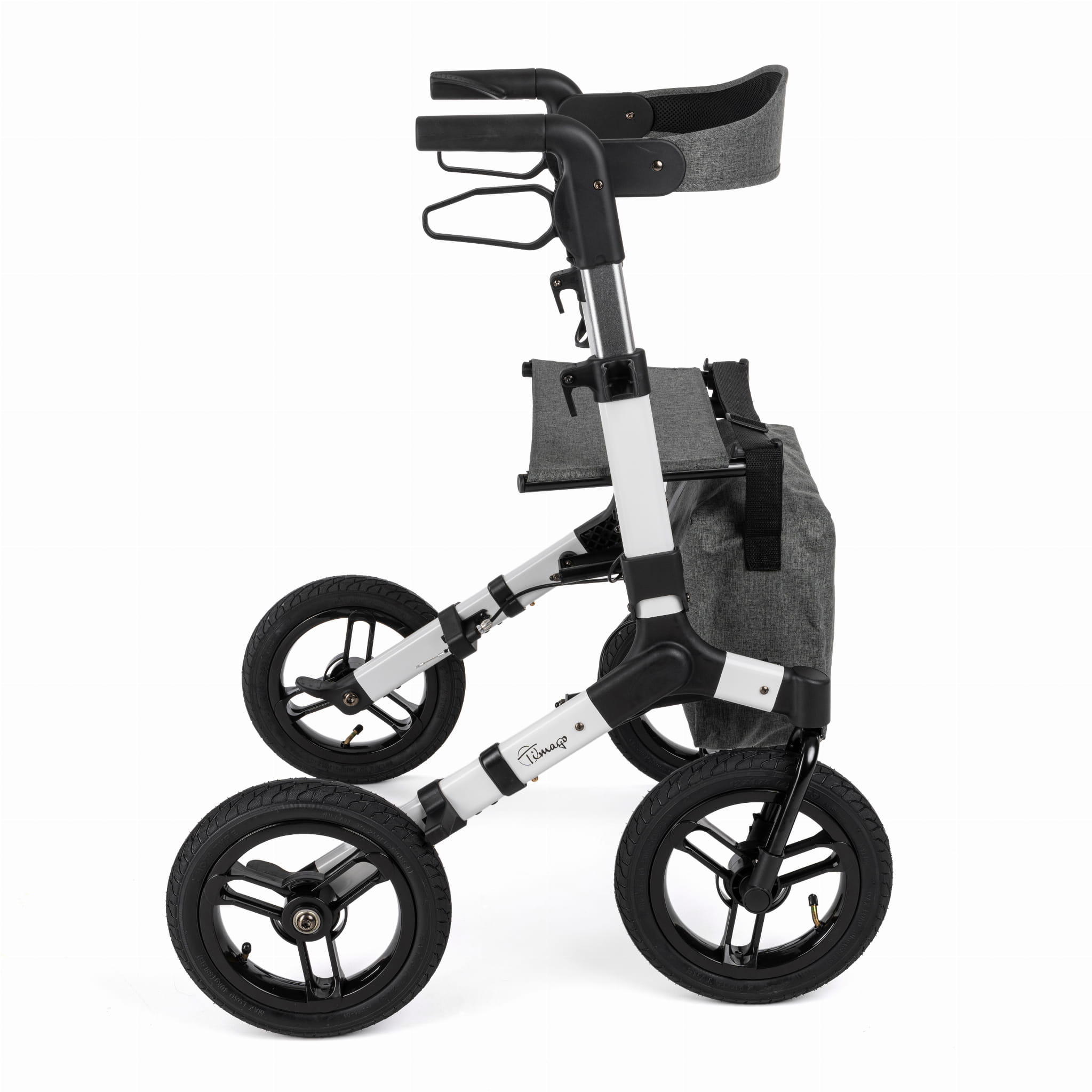 Podpórka czterokołowa aluminiowa - RANGER - składana, wykonana z ramy aluminiowej. Posiada duże pompowane koła o średnicy 12’’ oraz regulowane na wysokość rączki zakończone anatomicznymi uchwytami.