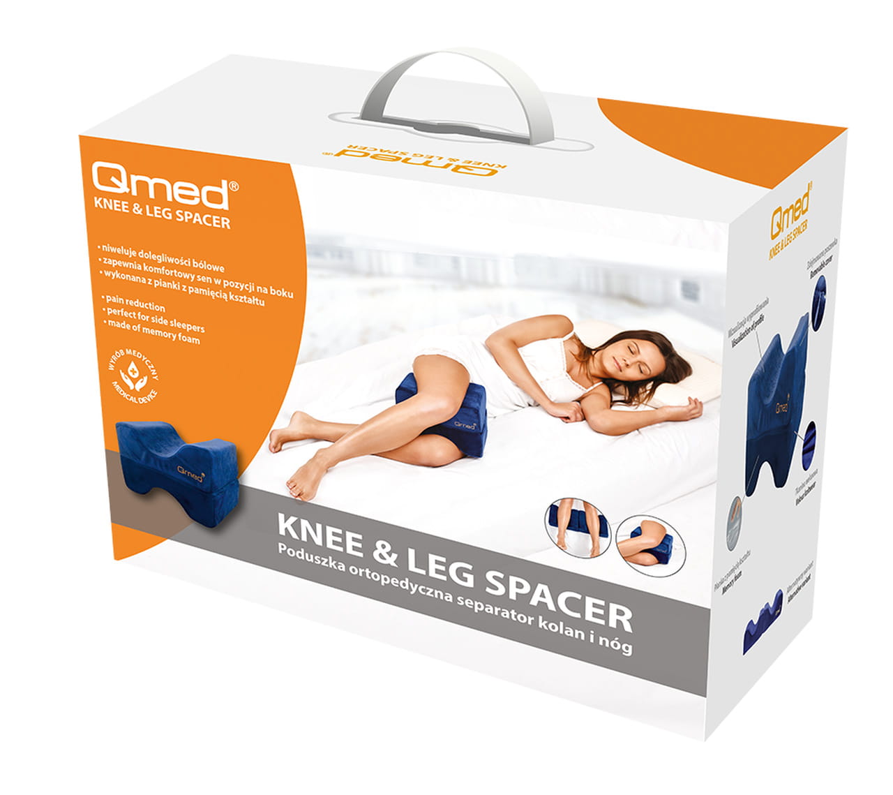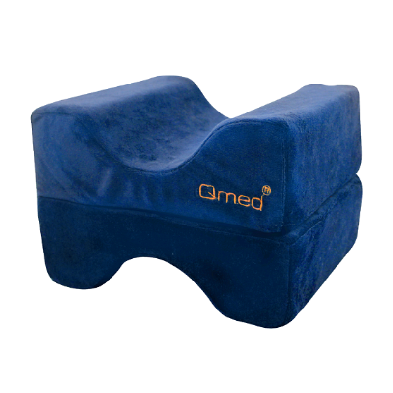 Poduszka separator Knee & Leg Spacer marki Qmed używana w dwóch formach. Używana w formie zamkniętej (pełnej kostki) zapewnia prawidłowe, anatomiczne ułożenie bioder oraz miednicy w czasie leżenia na boku, redukując napięcie w stawach kolanowych, ból i zmęczenie odczuwane w nogach. Stosowana w postaci rozłożonej, stanowi podparcie dla dolnej części nóg w celu właściwego pozycjonowania pacjenta oraz w profilaktyce przeciwodleżynowej.