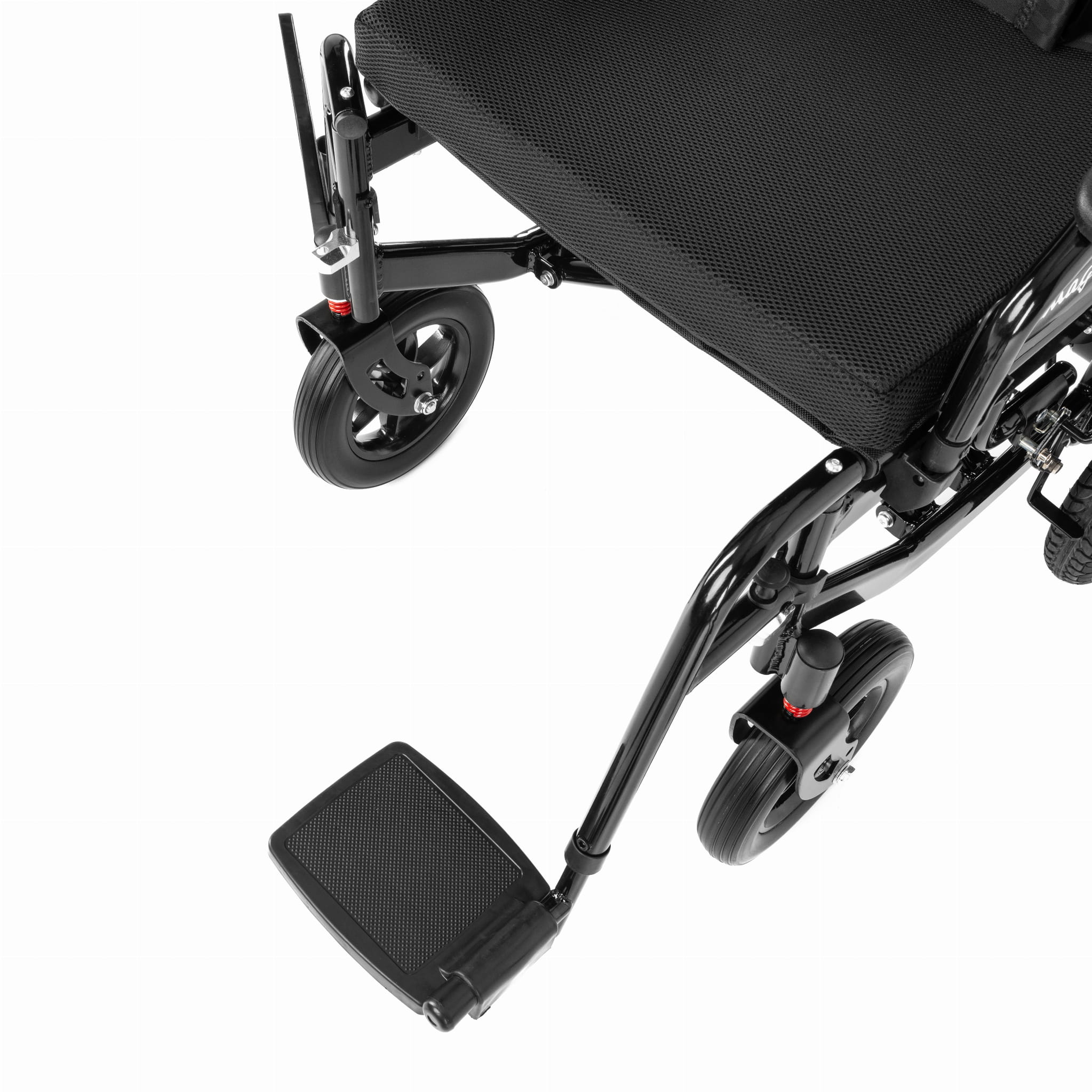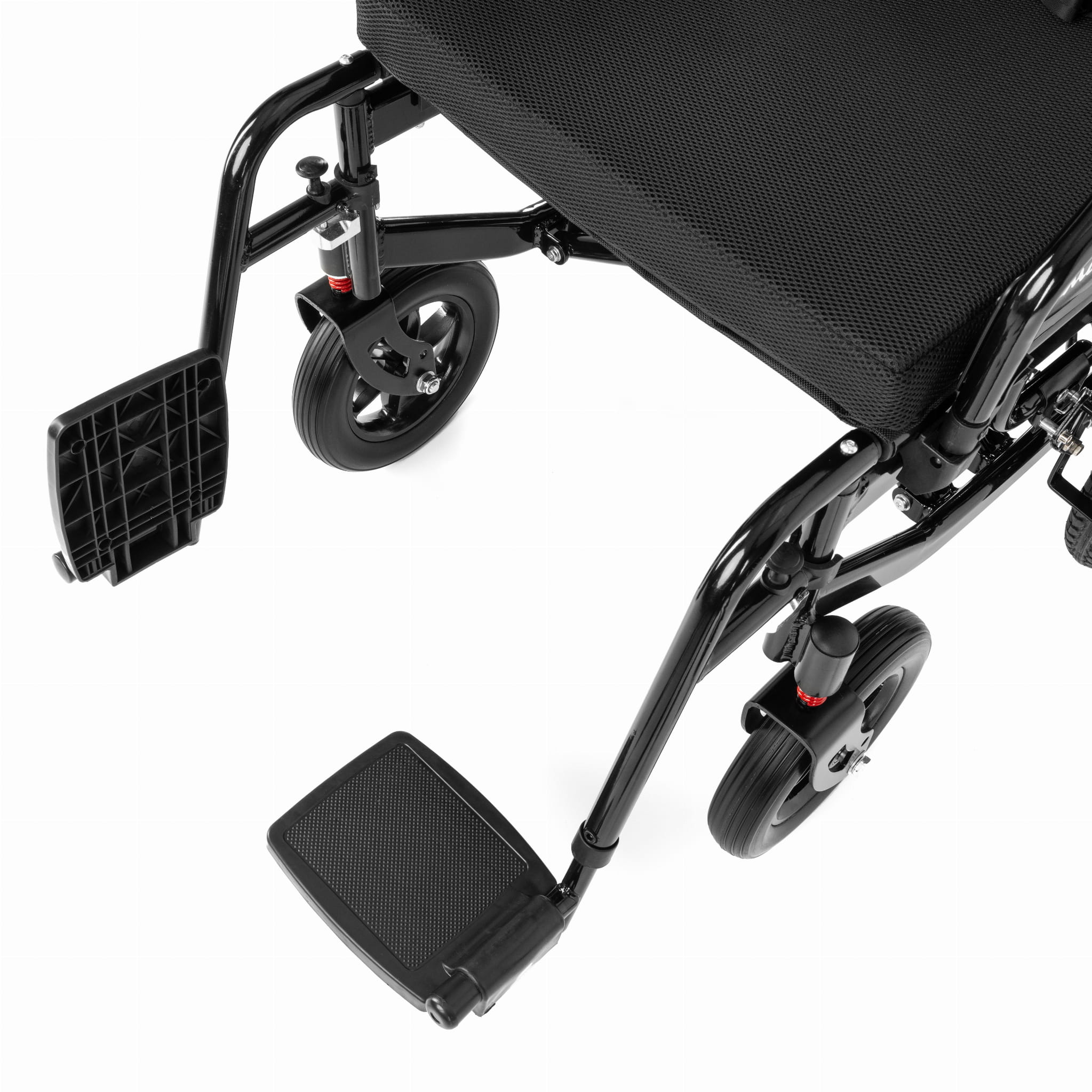 Dodatkowo wózek posiada składaną ramę krzyżakową, co znacznie ułatwia przechowywanie i transport. Dzięki odpinanym podnóżkom oraz składanemu oparciu (łamane oparcie), wózek bez problemu zmieści się nawet w niewielkich bagażnikach samochodowych.